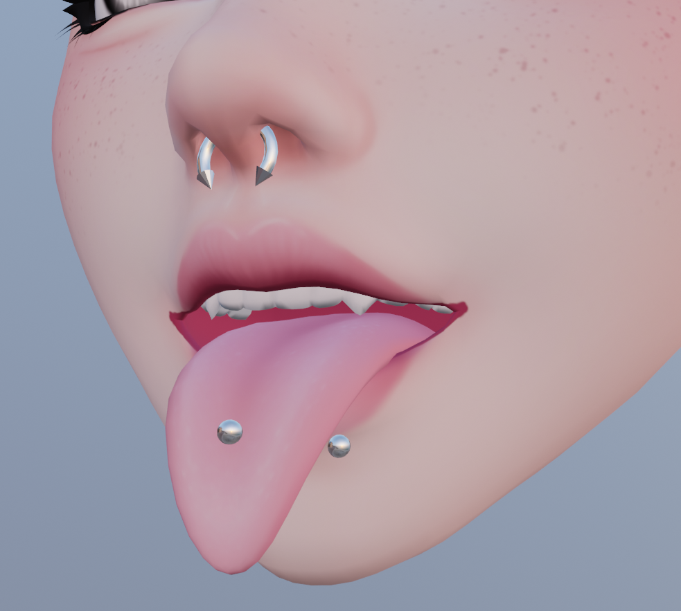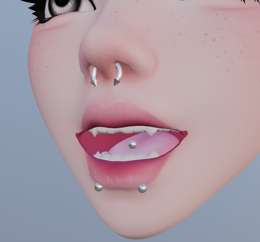 Snake Bite Lip Piercings, Septum Piercing, and Tongue Piercing made from scratch in Blender by me.